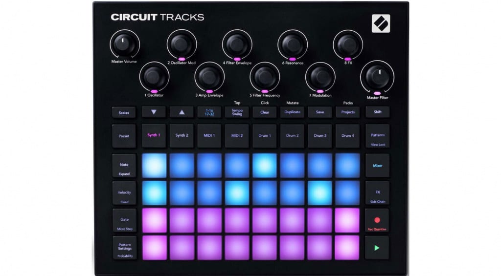 The form factor is very familiar and remains close to the original. The number of knobs, pads and buttons remains the same with just some stylistic changes. Digging around the button labels we find the two synths but also two MIDI tracks along with the four drum tracks. There’s also mention of probability, micro-steps and Mutate which I hope is a take on the Mutate function on their LaunchKey MIDI controllers.
